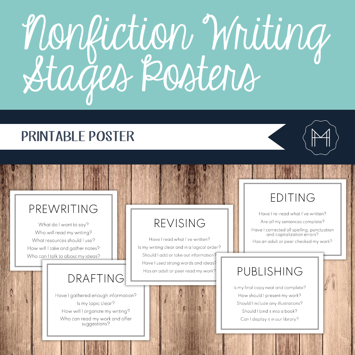 Nonfiction writing has always been a favorite in my classroom, but sometimes the students find it challenging to really internalize the writing stages and what each entails. These posters were designed to act as a guide for the students as they moved through the writing process. They can be printed on white or colored paper and hung in descending order.