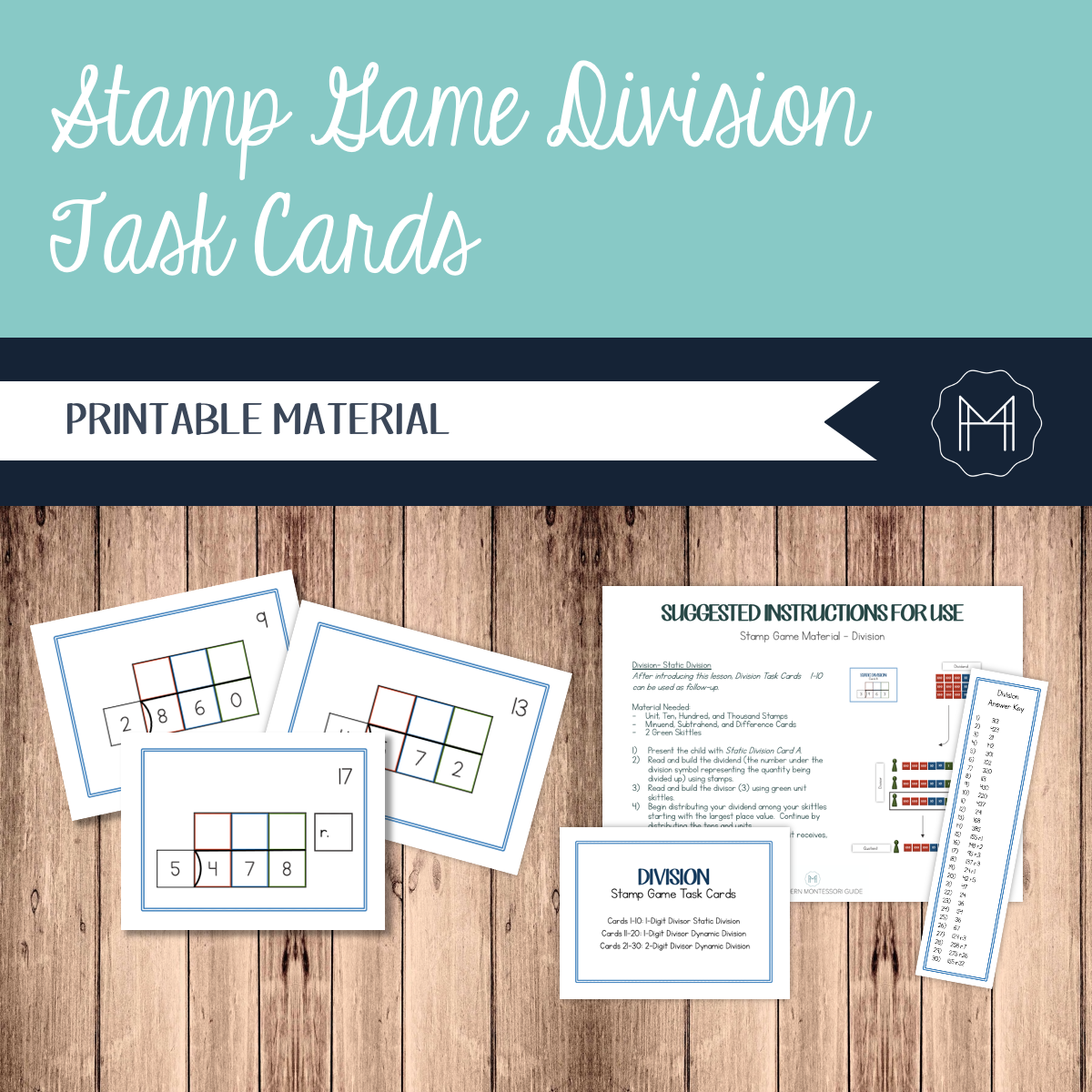 - Pg. 2-5: Stamp Game Division Lesson Suggestions and Example Cards