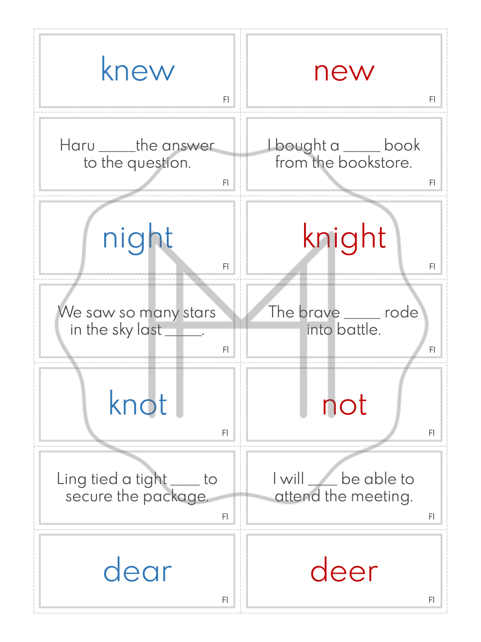 The black and white/colored outline and blue and red sets are interchangeable. Use whichever meets the needs of your students best. The blue and red cards act as an additional visual cue. The colored outline cards can be printed using the black and white setting on a particular color of paper to differentiate them from other word study sets.
